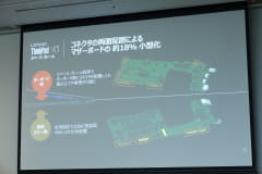 大和研究所機構開発プロジェクト#1筐体設計リーダーの堀内茂浩氏は、今回からフラッグシップモデル「X1 Carbon」シリーズで新たに導入された「スペース・フレーム」構造を解説する。これまでと異なり、マザーボードの両面にモジュールを配置するなど、これまで無駄になっていたスペースを有効活用し、かつ軽量性とメンテナンス性を両立させた構造となっている。