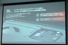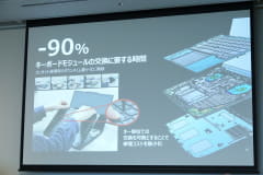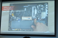堀内氏は、「部品が交換可能なだけでなく、少しでも簡単に作業できるようにこだわっている」とコメント。たとえば、背面カバーを取り外そうとねじを回すと、手を入れる隙間が自動で空いたり、バッテリー交換ではユーザーが爪を押し出すだけで外れ、ロック部分を押すだけで装着できる機構を取り入れている。