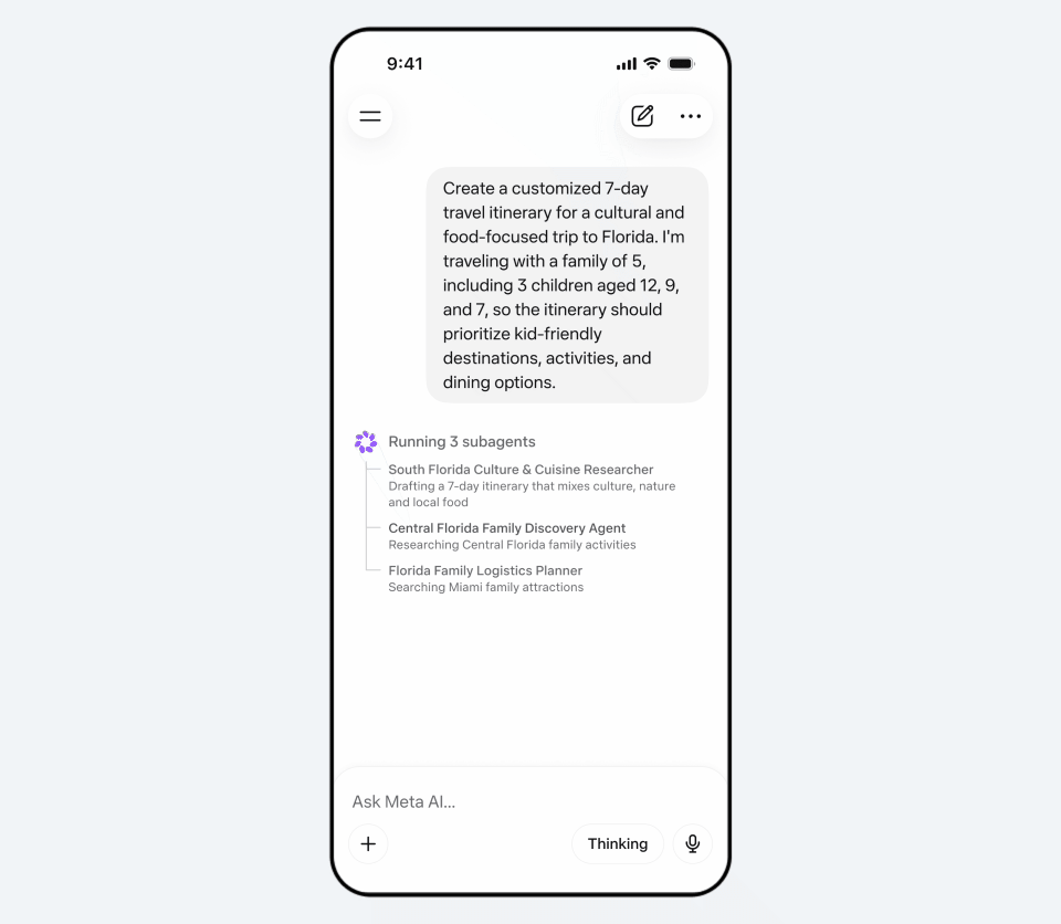 同モデルの導入にあわせて、Meta AIの機能が刷新された。タスクに応じてモードを切り替え、複数のサブエージェントが並行して作業を行うことが可能となった。旅行の計画において、旅程の作成や目的地の比較、アクティビティの検索を複数のエージェントが同時に進められる。