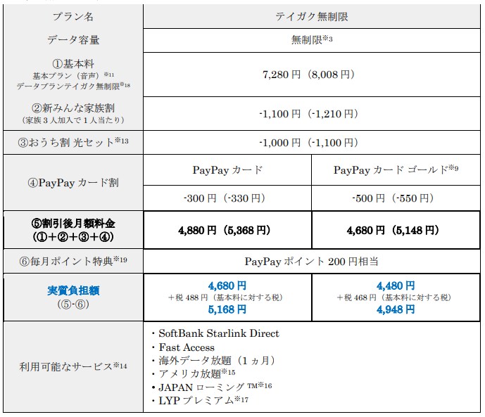 「テイガク放題」は、無制限のデータ通信と、「SoftBank Starlink Direct」など複数のサービスがセットになった通信プラン。基本料は月8008円で、「新みんな家族割」「おうち割 光セット」「PayPay カード割」などの割引を利用することで、最安で月5148円で利用できる。