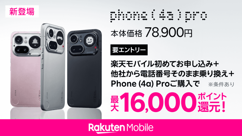 楽天モバイルから「Nothing Phone (4a) Pro」発売、約7.9万円