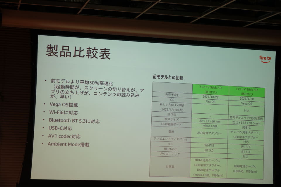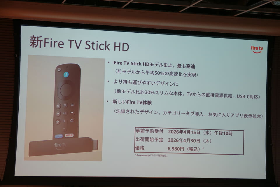 西端氏は、自社データとしてFire TVデバイスの利用状況の調査結果を取り上げる。2024年の調査では、Fire TVデバイスをスマートテレビに挿して利用しているユーザーが47.6%となっている。「スマートテレビを使いたいユーザーは、ストリーミングコンテンツをより快適に使いたいというニーズが広がっている」と西端氏は指摘する。エントリーモデルとして発売されている「Fire TV Stick HD」も、「非常に人気が高いモデル」だとし、価格を維持しながらも性能を向上する意義を説明した。
