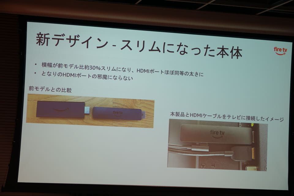 本体サイズは、前モデル比で横幅が約30%縮小した。テレビに接続するHDMI端子により近い太さとなり、隣のHDMI端子に干渉しにくいサイズに収めた。