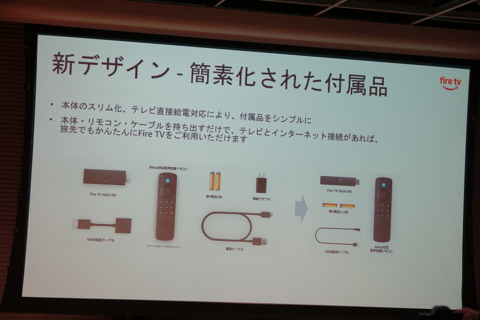 多くのユーザーが、すでにテレビのUSB端子から電源供給していた実情があったが、アマゾンジャパンのAmazonデバイスFire TV事業部の西端明彦事業部長は「これまでAmazonからアナウンスしてこなかった。同機から正式に対応する」とコメント。同機から電源アダプターの同梱も終了する。