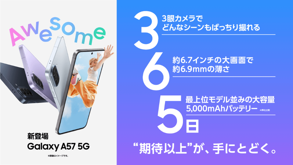 NTTドコモは、サムスン電子製のAndroidスマートフォン「Samsung Galaxy A57 5G SC-54G」を4月23日に発売する。