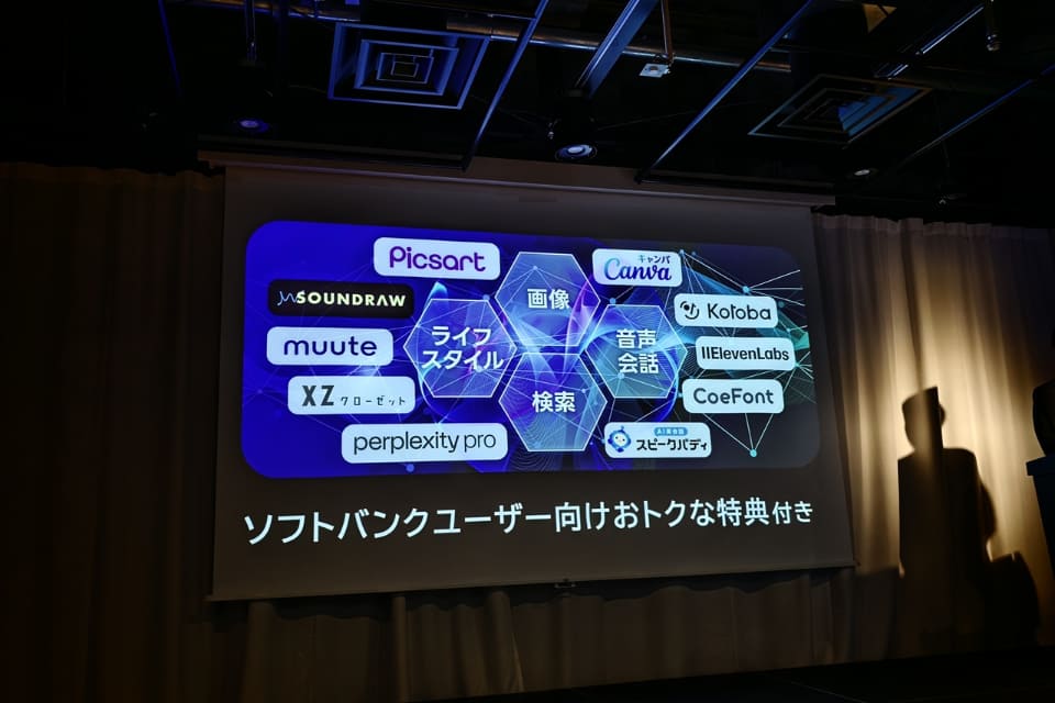 ソフトバンク、ワイモバイル、LINEMOのユーザーには「ソフトバンクユーザー向け特典」が用意され、各サービスを契約する際に割引や無料期間などの優待が受けられる。たとえば特典として、「Perplexity Pro」の6カ月間無料や、「Canva Pro」の3カ月間無料、「スピークバディ」の12カ月プラン30%オフなどが提供される。