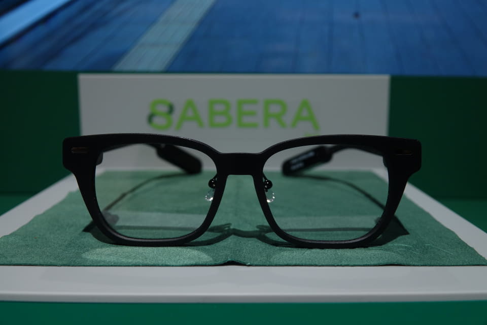 「SABERA スマート眼鏡」は、眼鏡の自然な装着感を追求しながら、ディスプレイを搭載したARグラス。緑色で表示できるMicro LEDを1つ搭載し、「通知」「ナビゲーション」「原稿表示」「文字起こし」「リアルタイム翻訳」「AIアシスタント」などの機能が利用できる。当初は利用の拡大を重視するとして、AI機能の利用料はかからない。将来的にはサードパーティアプリへの対応も視野に入れる。