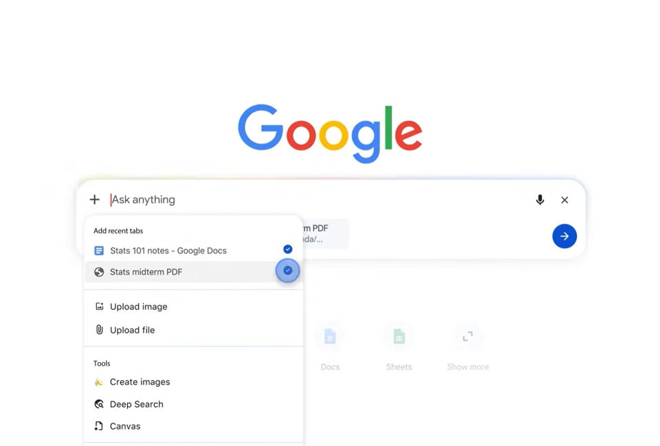 AIモードが、現在開いているタブの内容を踏まえて回答できるように。必要なタブを複数選択することができ、ほかにも画像やPDFファイルを追加できる。これにより、開いているタブの情報やファイルを踏まえて、AIモードが回答できるようになる。