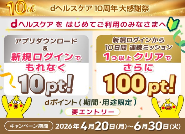 NTTドコモは、健康管理アプリ「dヘルスケア」の提供開始10周年を記念し、「dヘルスケア 10周年大感謝祭」を開始した。9月30日までの期間中、dポイントの進呈や人気有料機能の試用キャンペーンなどが順次実施される。