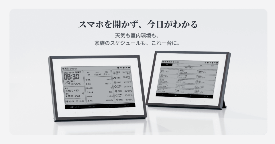 本製品は、7.5インチの電子ペーパーを採用。時計、天気予報、室内外の温湿度、空気質、カレンダー、アラームなど、必要な情報を一目で確認できる。Google、iCloud、Outlook、Yahooの各カレンダーとの同期にも対応する。