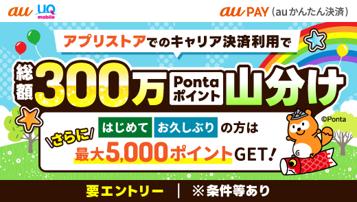 キャンペーンでは、AppleアカウントまたはGoogleアカウントの支払い方法に「au PAY(auかんたん決済)」を設定し、対象サービスで通算2000円以上利用すると、総額300万ポイントのPontaポイントの山分けに参加できる。支払い金額に応じて獲得できる口数が異なり、5万円以上の利用で最大となる100口を獲得できる。