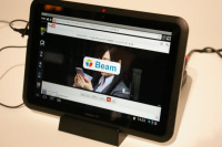 「Twonky Beam Browser」は、インターネット上の動画をタブレットで受信し、DLNA準拠テレビに映し出して観賞できるアプリ。動画の再生停止・音量調節といった操作は、タブレット側で行い、映像はテレビで楽しむ。対応動画サイトは、YouTube、JOOKEYなどで今後拡大する予定。ドコモのタブレットユーザーが2012年3月31日までに登録すると、通常は有料となるアプリが無料で利用できる。
