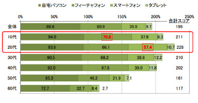 同調査によれば、インターネット利用時の端末は、「自宅パソコン」が88.6%、従来型の携帯電話である「フィーチャーフォン」が60.9%、「スマートフォン」が35.5%、「タブレット」が9.7%となった。どの年齢層でも、自宅パソコンが最も利用率が高いという結果になり、50代以上では携帯電話やスマートフォン、タブレットの利用が少ない。10代~40代で見ると、全体よりもややフィーチャーフォンの利用傾向が高く、特に10代ではフィーチャーフォンが70.8%、スマートフォンが37.9%となった。ただ、20代はフィーチャーフォンが66.1%で、さらにスマートフォンが57.4%を占め、各年齢層のうち、唯一、スマートフォン利用率が50%を超えた。