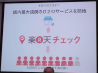 「楽天チェック」はスマートフォンに無料の専用アプリをインストールし、加盟店舗へ来店、アプリでチェックインすると「楽天スーパーポイント」が貯まるO2Oサービス。加盟店舗はユーザーの属性を絞ったお得情報やクーポン配信なども可能となり、効果的な販促施策を展開できるメリットがある。