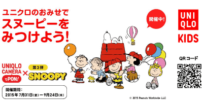 「CAMERAでPON!」は、ユニクロの店内にあるマーカーをとらえると、キャラクターが表示されるアプリ。青いマーカーをとらえると、被写体との合成写真を楽しめる。また、赤いマーカーをとらえるとキャラクターをコレクションできる。店舗で配付されている「こどもニュース」に付属するぬりえに色を塗って「CAMERAでPON!」でとらえると、3Dのスヌーピーが登場して動き出す。