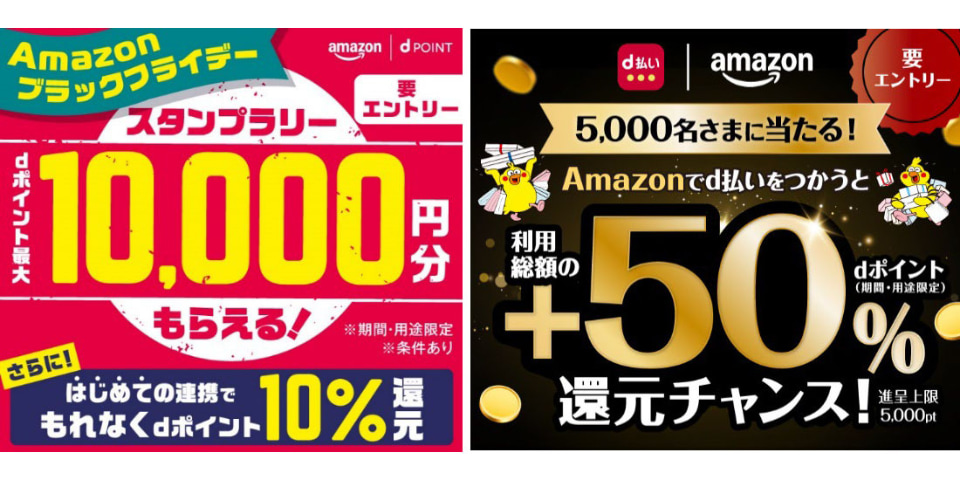NTTドコモは、「Amazon ブラックフライデー」の開催に合わせたキャンペーンを実施する。期間は11月21日~12月1日。dポイントやd払いを利用することでdポイントが還元される。