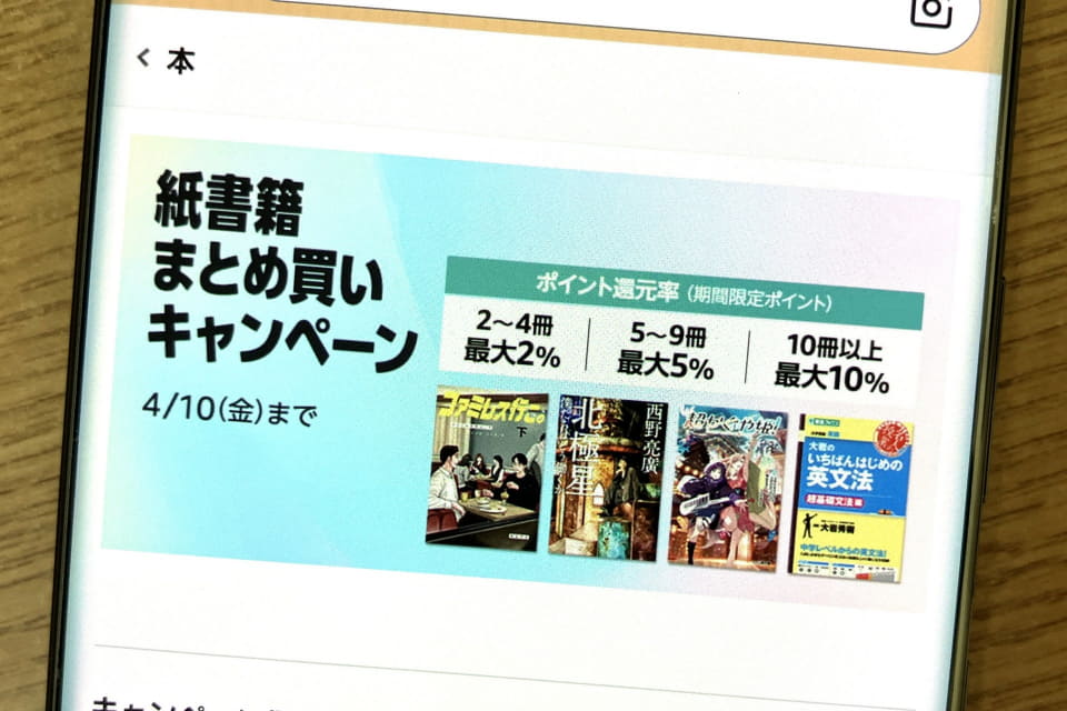 Amazon.co.jpで「紙書籍まとめ買いキャンペーン」が始まった。期間は4月10日まで。1回の注文手続きで購入した冊数に応じて、ポイントが付与される。