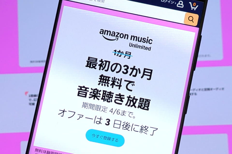 【注目アイテム】本日のPICK UPAmazon Music Unlimitedが3カ月無料、6日まで 高橋 陸2026年4月3日 17:20 音楽配信サービス「Amazon Music」で、「Amazon Music Unlimited」の個人プラン(月額1180円)が3カ月間無料となるキャンペーンが実施されている。期間は4月6日まで。 対象者はAmazon Music Unlimitedに新規会員登録するユーザー。 3カ月間の無料体験期間終了後は自動更新され、月額1180円が更新日に請求される。プライム会員の場合は月額1080円となる。自動更新しない設定に変更すると、無料体験期間終了後の請求は発生しない。 Amazon Music Unlimited無料体験を始める