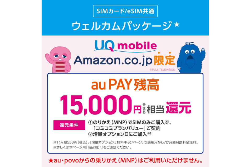 また、他社から乗り換え(MNP)で、「コミコミバリュープラン」を契約し「増量オプションII」に加入すると、1万5000円相当のau PAY残高が還元される。