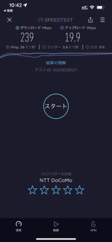 参考に、筆者宅に設置場所を変更して通信速度を測定した結果は、以下の通りです。宅内の窓付近に「home 5G HR01」を設置した場合は下り239Mbps / 上り19.9Mbps、窓から離れた場所に設置した場合は下り51.7Mbps / 上り4.48Mbpsとなりました。
