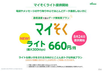 mineoの料金プラン「マイピタ」の料金は、1GBで1180円。5GBで1380円。10GBで1780円。20GBで1980円となる。「マイそく」は通信速度で料金が決められるコース。月額990円で1.5Mbpsもしくは3Mbpsで月額2200円。より低価格な新コース「マイそくライト」(月額660円)も利用できる。
