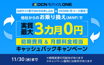 11月30日まで、キャッシュバックによりMNPで最大3カ月実質0円のキャンペーンを実施している。
