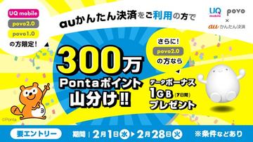 2月28日までの期間中、UQ mobile、povo1.0および2.0のユーザーがauかんたん決済で合計3000円以上支払うと、キャンペーン参加ユーザーの数に応じて総額300万ポイントを山分けしてプレゼントする。加えて、povo2.0ユーザーにはデータボーナスを1GB(7日間)プレゼントする。