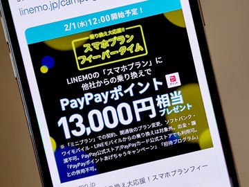 2月6日12時までの期間中、キャンペーンページから、MNPでLINEMOの料金プラン「スマホプラン」へ申し込むと、1万3000円相当のPayPayポイントが付与される。
