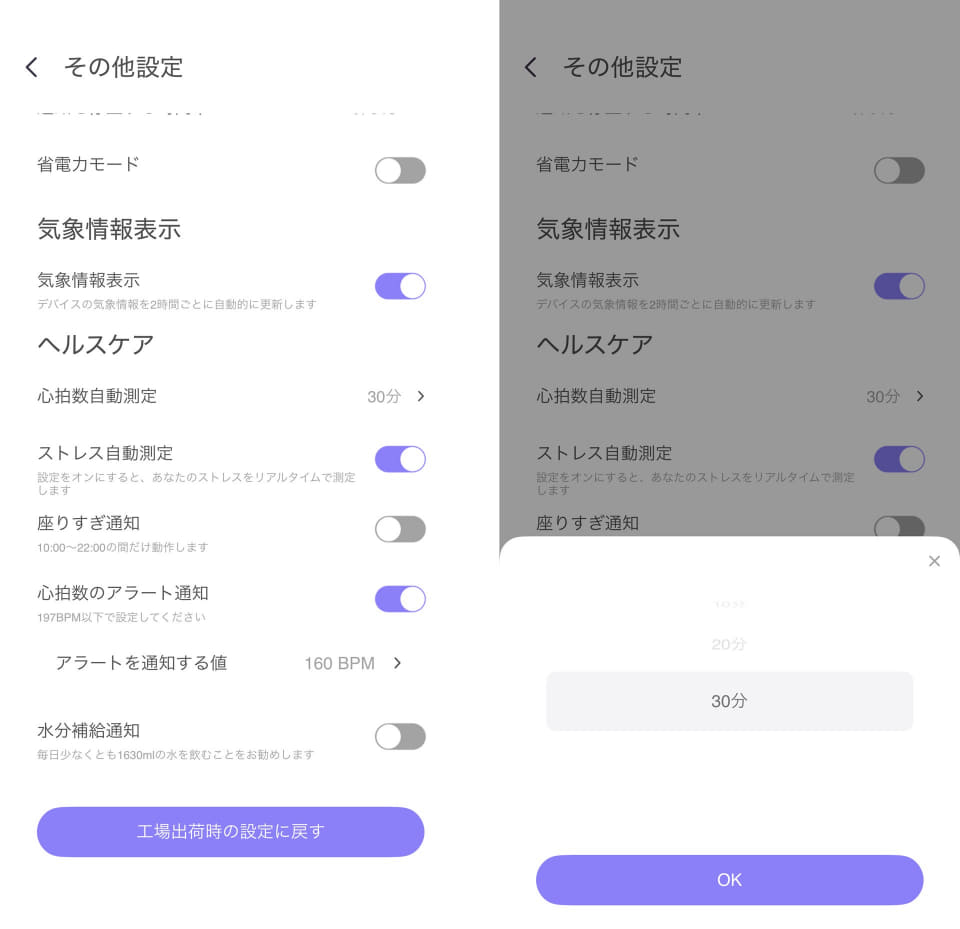 心拍数は自動でモニタリングする間隔を設定でき、血中酸素飽和度は手動で測定できるほか、睡眠時には自動で測定される。基本的には、ただ着けていれば、自動で健康状態がチェックされる。