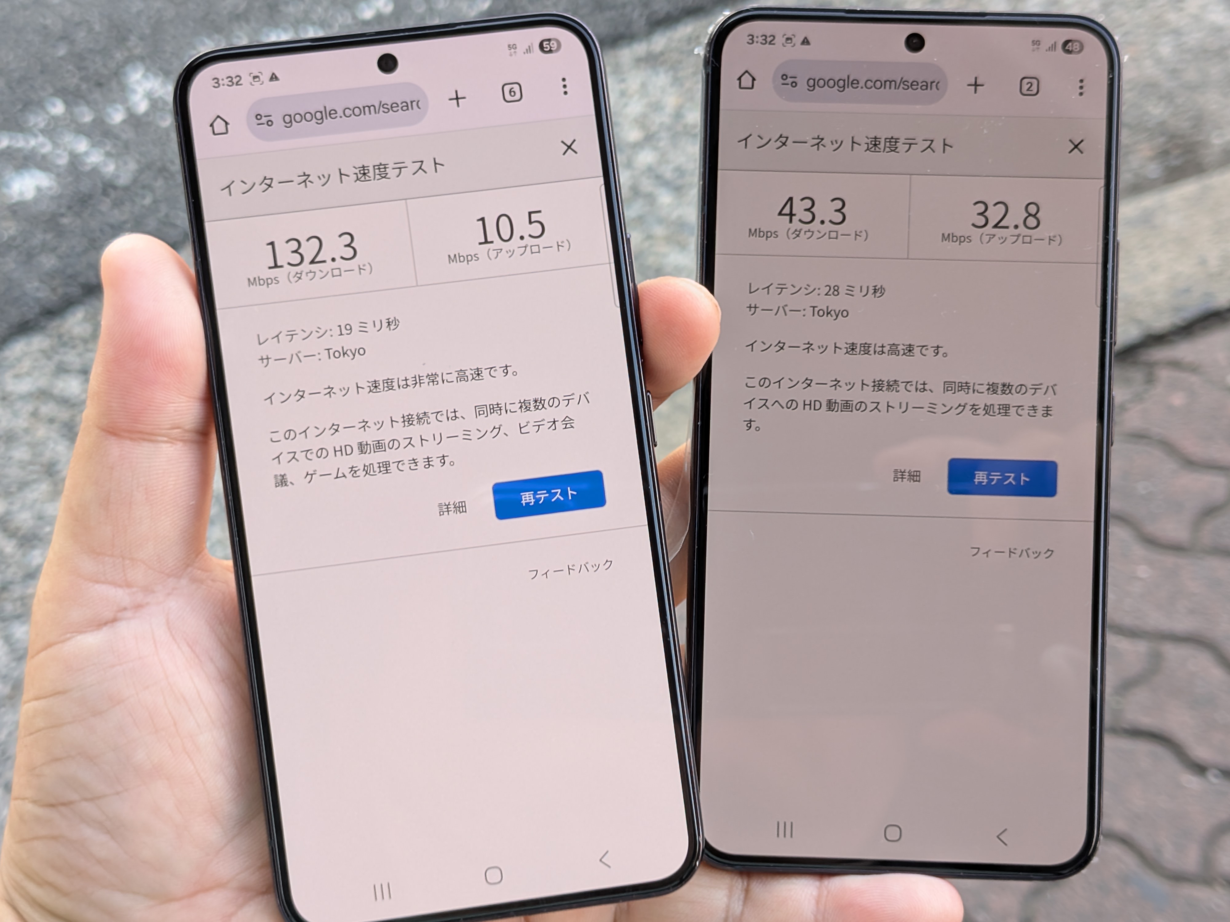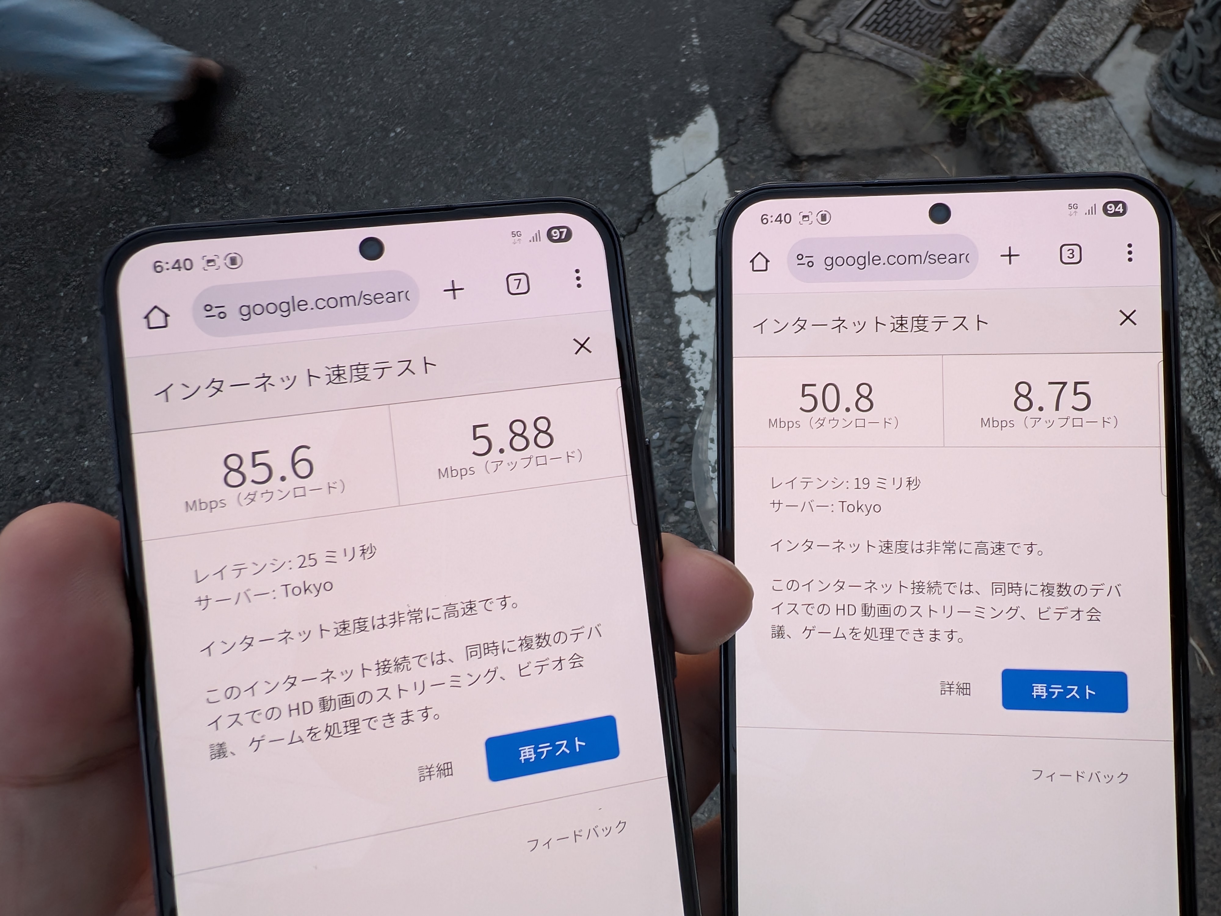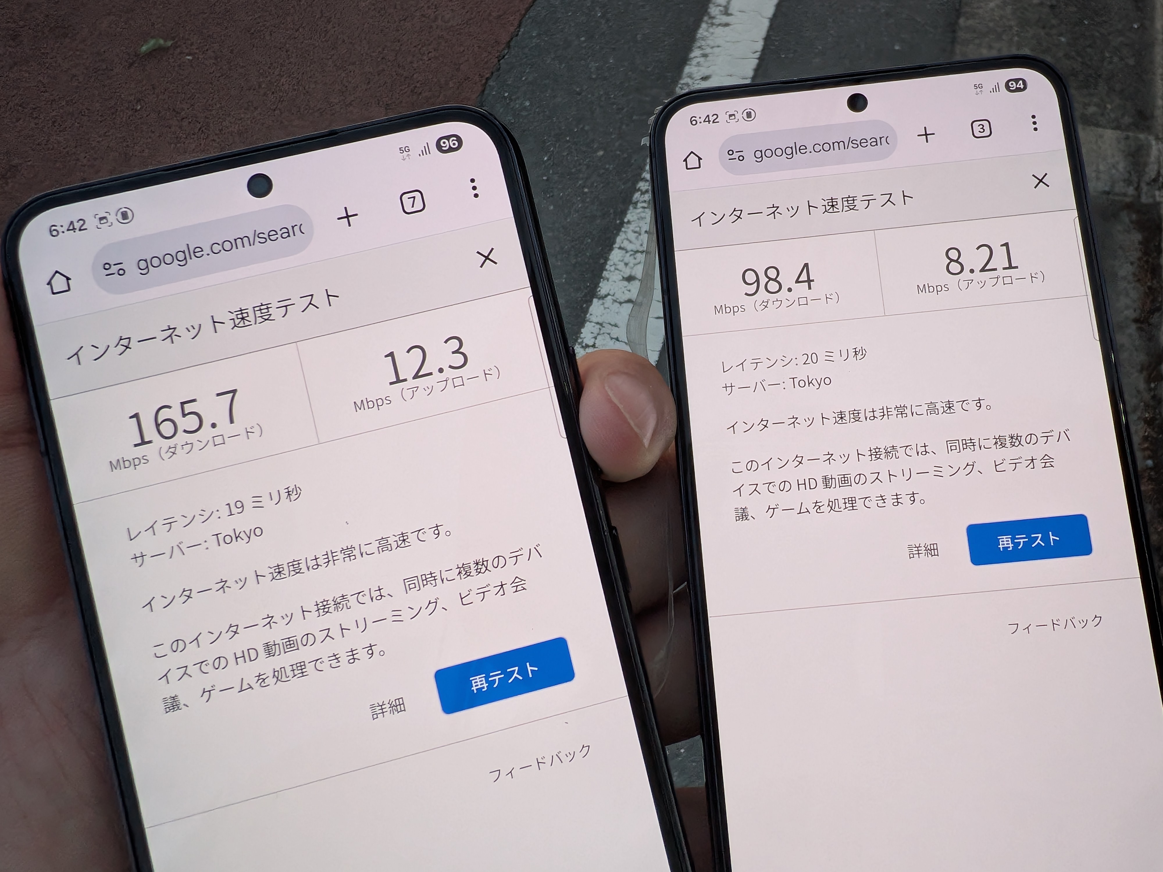 まずはスピードテストの結果をお伝えしよう。今回はGoogle 検索のスピードテスト機能だけを用いた。通信速度は場所によって異なるが、結論から言えば、「au 5G Fast Lane」対応回線でのスピードは何度テストしても、ほとんどの場合、非対応回線よりも速かった。