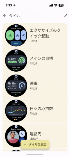 タイルの並びや種類は、スマートフォンのWatchアプリで変更可能。全部で35種類のタイルが用意され、自由に設定可能だ。