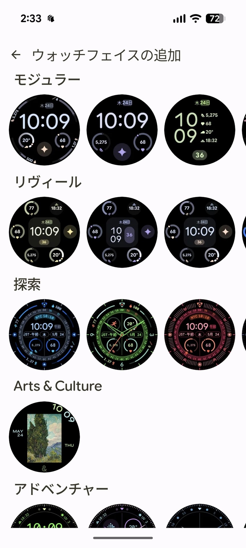 このほかにも「コルサ」、「リヴィール」、「探索」、「Art&Culture」など複数の新ウォッチフェイスが追加されており、新たな気分で利用できる。もちろん「アクティブ」、「アナログ」などの従来から用意されているウォッチフェイスも用意されているので、従来同様に利用したい場合でも安心だ。