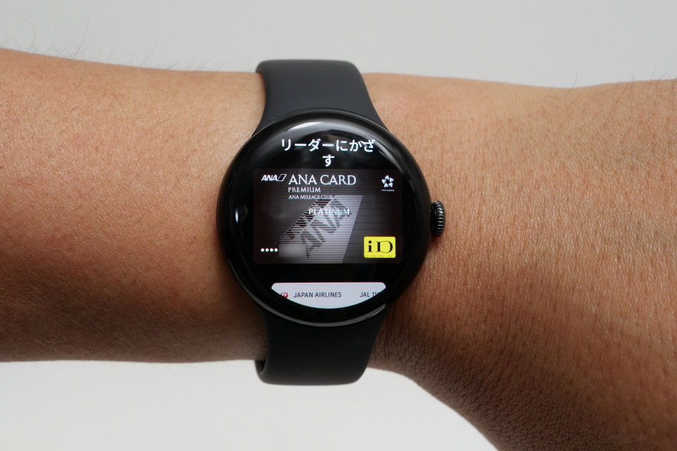 決済方法も従来同様で、電子マネーのSuica、PASMO、QUICPay、iD利用時には画面部分を決済端末にそのままタッチする。VisaとMastercardのタッチ決済は、リューズをダブルクリックし、その時点でまだPINを入力していない場合にはPINを入力。画面に登録カードの券面が表示された状態で決済端末にタッチすればいい。