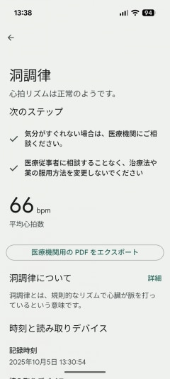 計測には30秒ほどかかるが、手軽に心拍リズムを計測して健康管理が行えるのはありがたい。また、結果をPDF形式のデータとして出力し、医療機関に提出することが可能となっているのも、何かあったときに備えられるという意味で嬉しい。