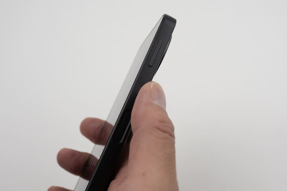 本体右側面には指紋認証センサー一体形の電源ボタンと音量ボタンを装備。電源部分はほぼ中央部分で押しやすいが、音量ボタンは本体上部に近く右手でグリップしたときに親指が届きにくい。