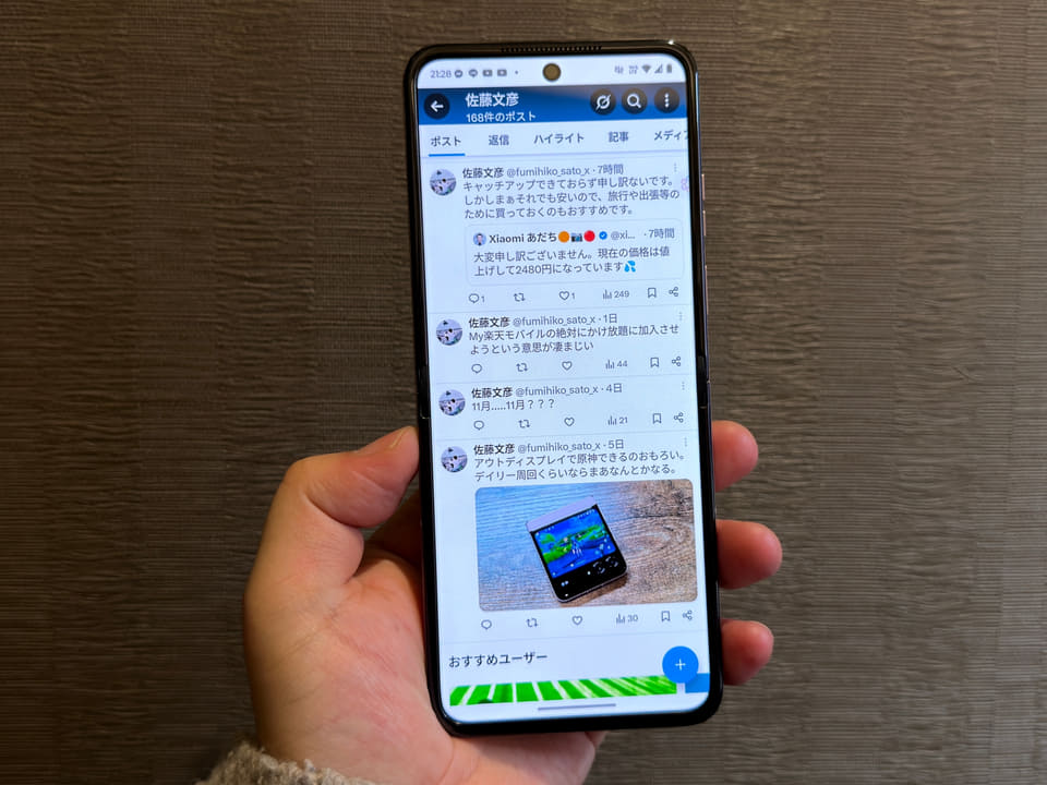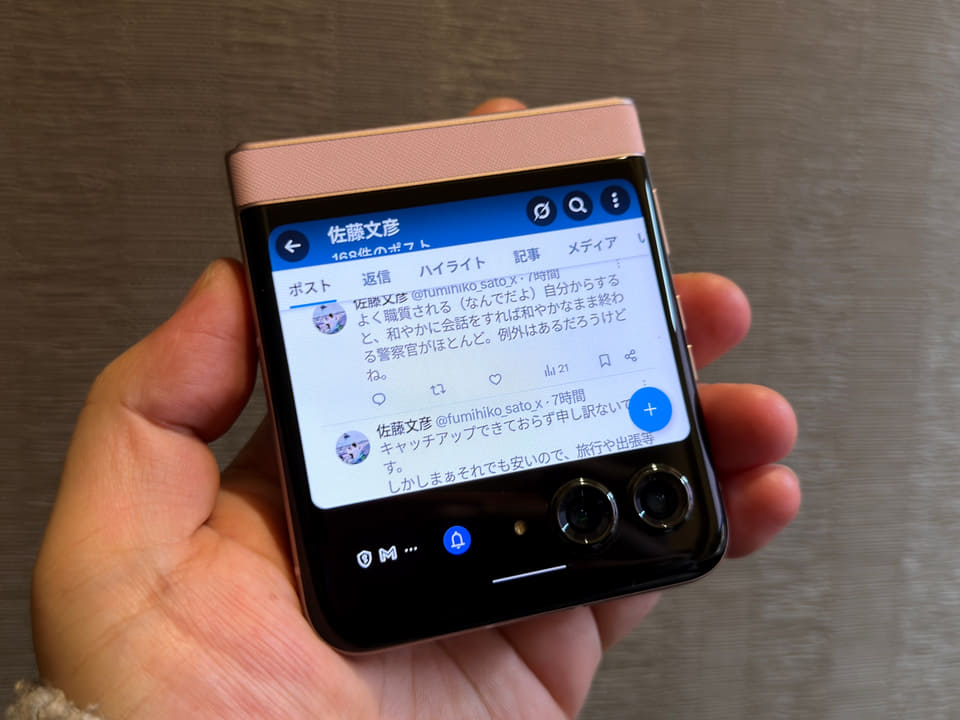 また、折りたたみというギミックの副産物ではあるが、メインディスプレイが縦に長いアスペクト比になりがちなのも、実は便利だ。アプリによっては若干微妙な表示になるが、SNSやWebサイトは見やすくなる。何より、本体を握りやすく、大画面でも使いやすい。