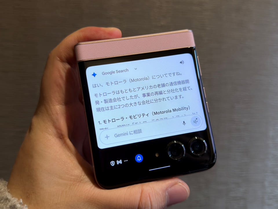 キーボードから文字入力を行うには、サイズ的に(できなくはないけど)少々苦しいが、音声でプロンプトを入力し、サクッと知りたいことを検索できるAI機能と掛け合わせることで、コンパクトな縦折りスマートフォンの魅力はさらに増している。