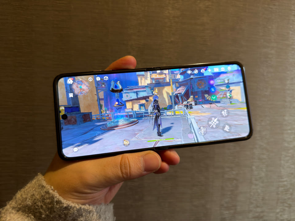 ゲームアプリなど、大きな画面を使いたいシーンでは、120Hzリフレッシュレートに対応した、約6.9インチの大画面が活躍する。触るとしっかりと折り目があることを感じるが、パッと見た印象としてはほとんど気にならず、スレート状のスマートフォンと遜色なく使える。