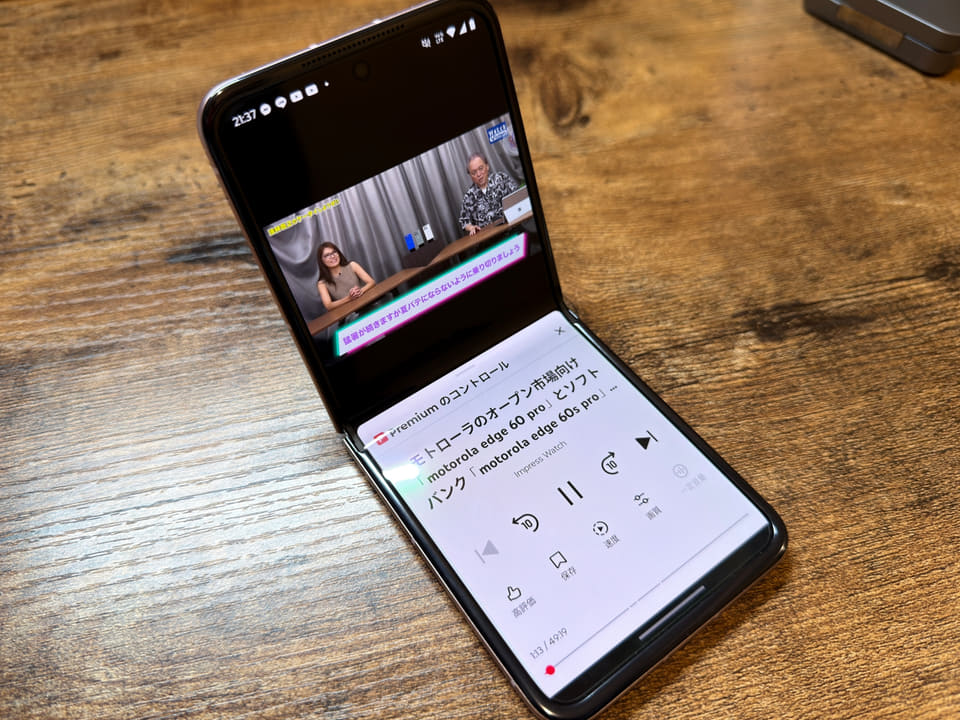 折りたたみスマートフォンを使っていて、実は最も利用頻度が高いのが、画面を90度前後に立ち上げるモードだ。YouTubeアプリやカメラアプリは、専用のUIが用意されており、半分折りの状態で快適に使えるようにデザインされている。