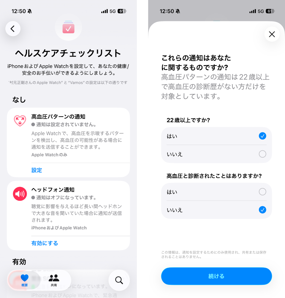 アプリを起動し、右上の自身のアイコンをタップ。次に「ヘルスケアチェックリスト」を開いて「高血圧パターンの通知」を選択する。最初に「22歳以上ですか?」「高血圧と診断されたことはありますか?」という質問が表示される。この機能は、22歳以上と高血圧と診断されたことがない人を対象としているため、22歳未満と、高血圧と診断されたことがある場合は、この機能を有効にできない。