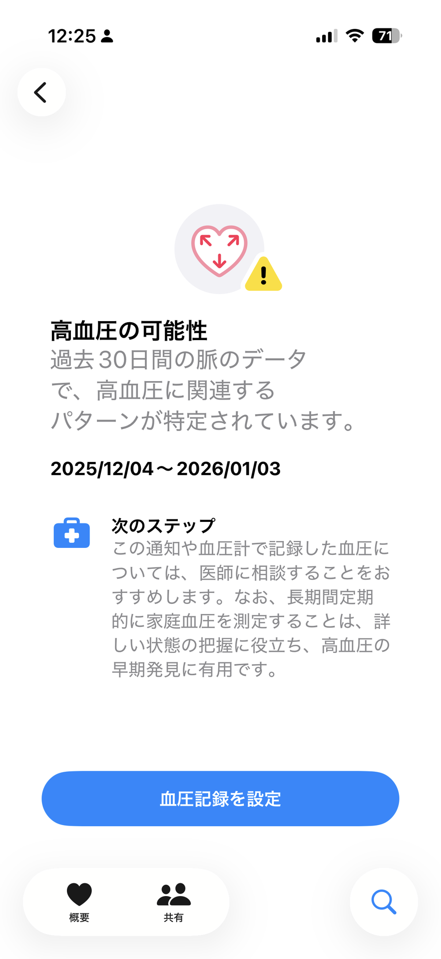 筆者は、普段から血圧を測っており、たまに血圧値が高くなることもあるが、この機能の有効性を試すために、「高血圧と診断されたことはありますか?」には「いいえ」と回答した。