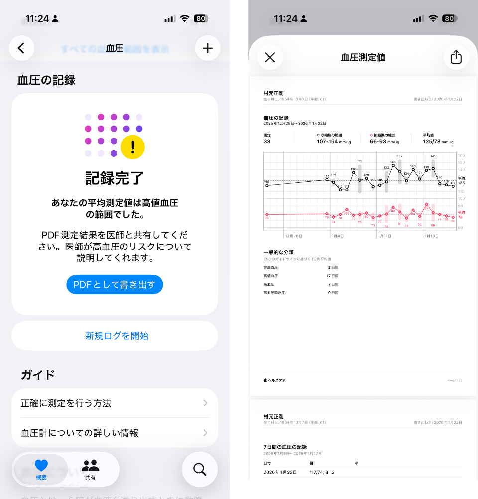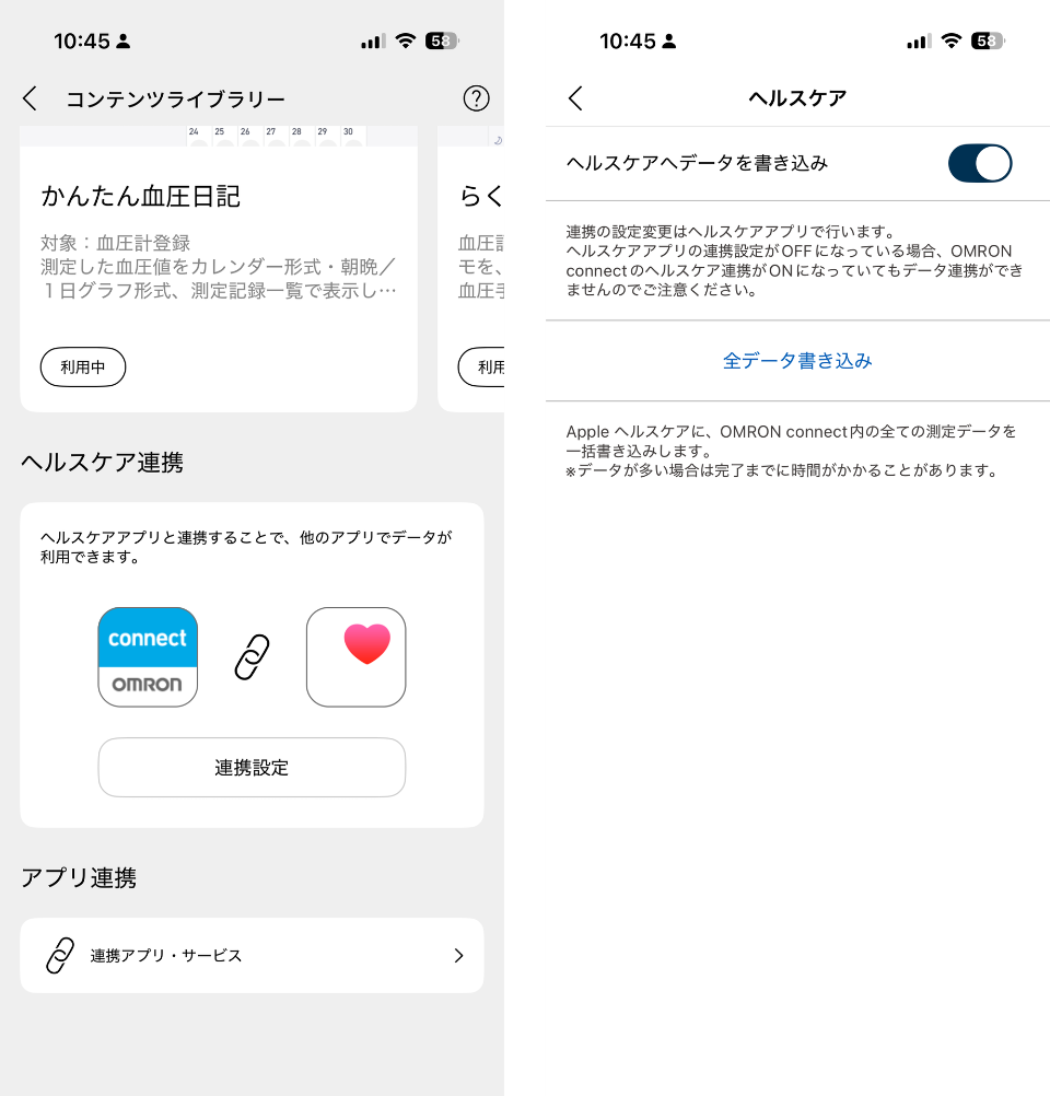 筆者はオムロン製の「HCR-750AT」という血圧計を使っている。家庭用として一般的な上腕にカフを巻くタイプだ。計測した血圧値は「OMRON connect」アプリに記録されるのだが、この「OMRON connect」とiPhoneの「ヘルスケア」アプリを連携させることが可能。「ヘルスケア」アプリで、ほかの健康データや運動の記録などと一緒に血圧値を管理できるようになる。記録した血圧値データをPDFで出力して、プリントしたりもできる。