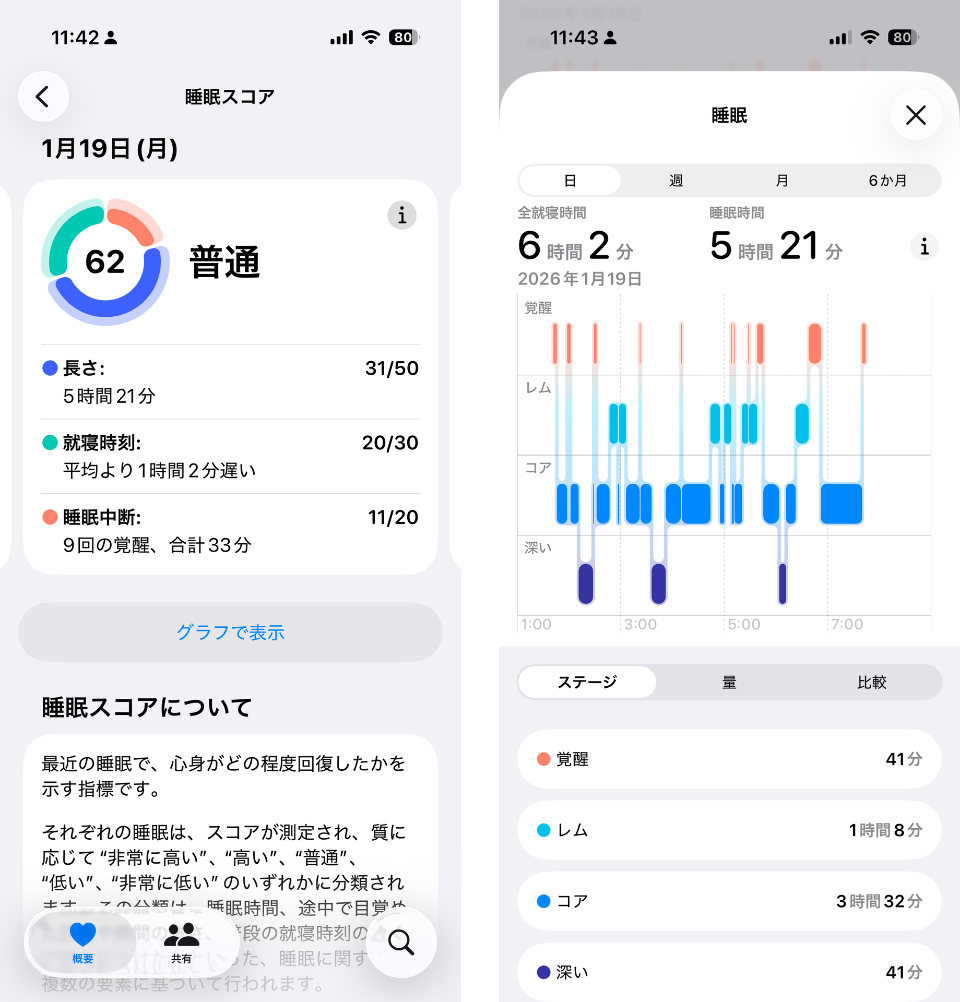 睡眠スコアは0~100で表示され、睡眠時間の長さ(50ポイント)、就寝時間の一貫性(30ポイント)、睡眠中断(20ポイント)の推定に基づいて計算される。合計点が96以上は「非常に高い」、81~95は「高い」、61~80は「普通」、41~60は「低い」、0~40は「非常に低い」と評価される。