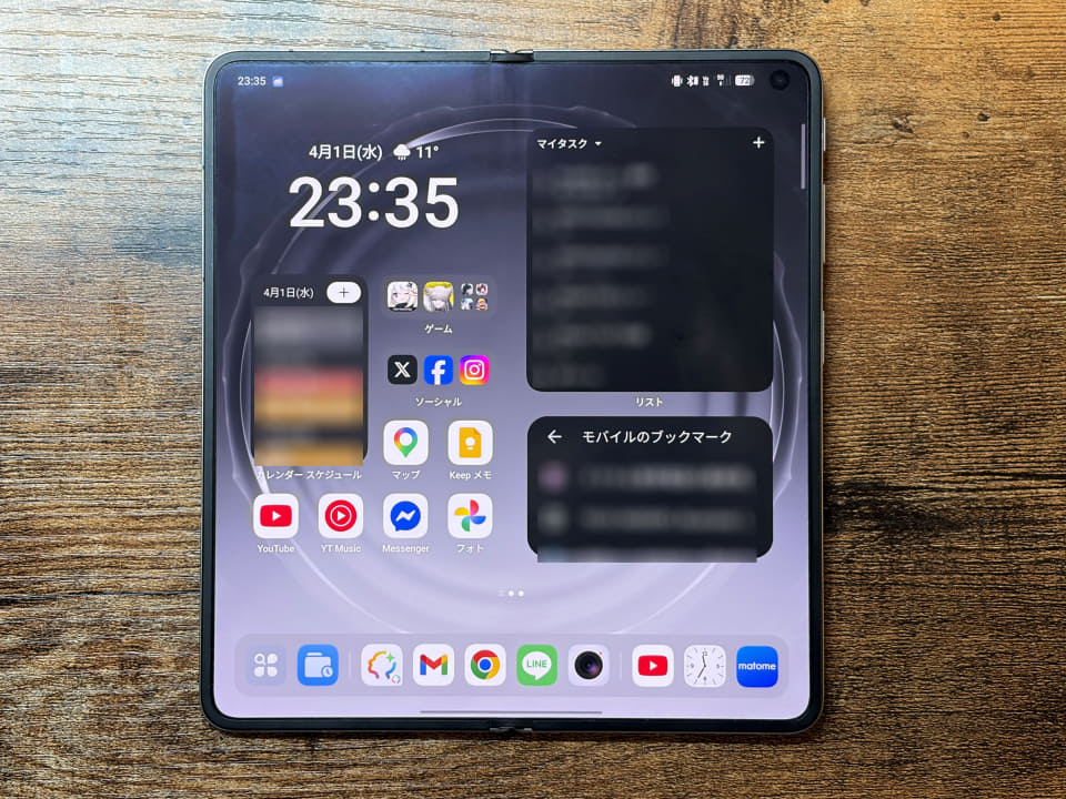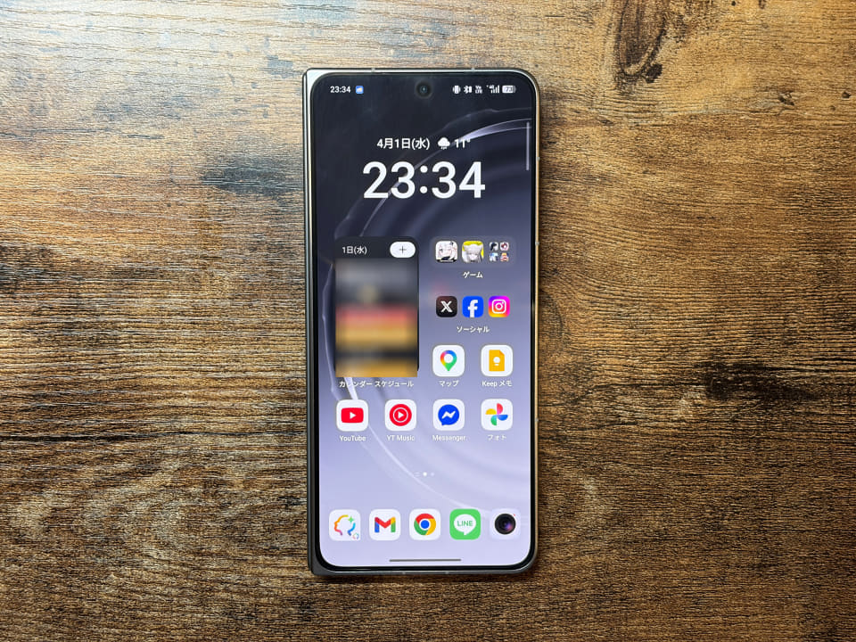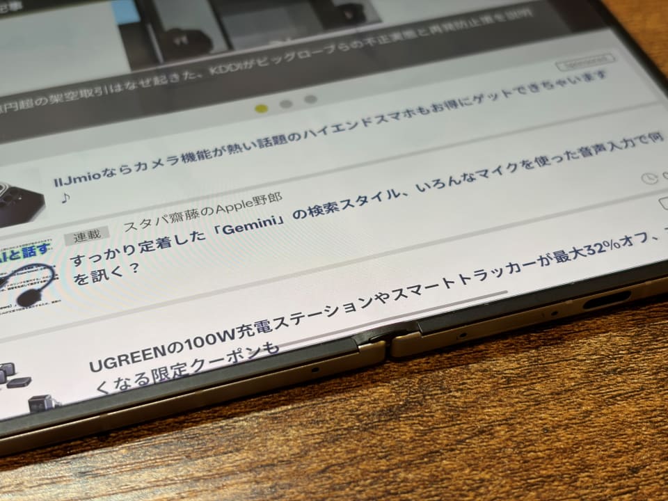 他社の折りたたみスマートフォンでは、動画やゲームなど、大画面を活かしたコンテンツを表示する際、折り目はどうしても気になっていたが、「OPPO Find N6」は使っていて全く気にならない。実際に指で触れると、わずかにへこみがあることがわかるが、画面の中心付近を触る機会は意外と少ないため、実用上は折り目を体感するシーンがほとんどない。