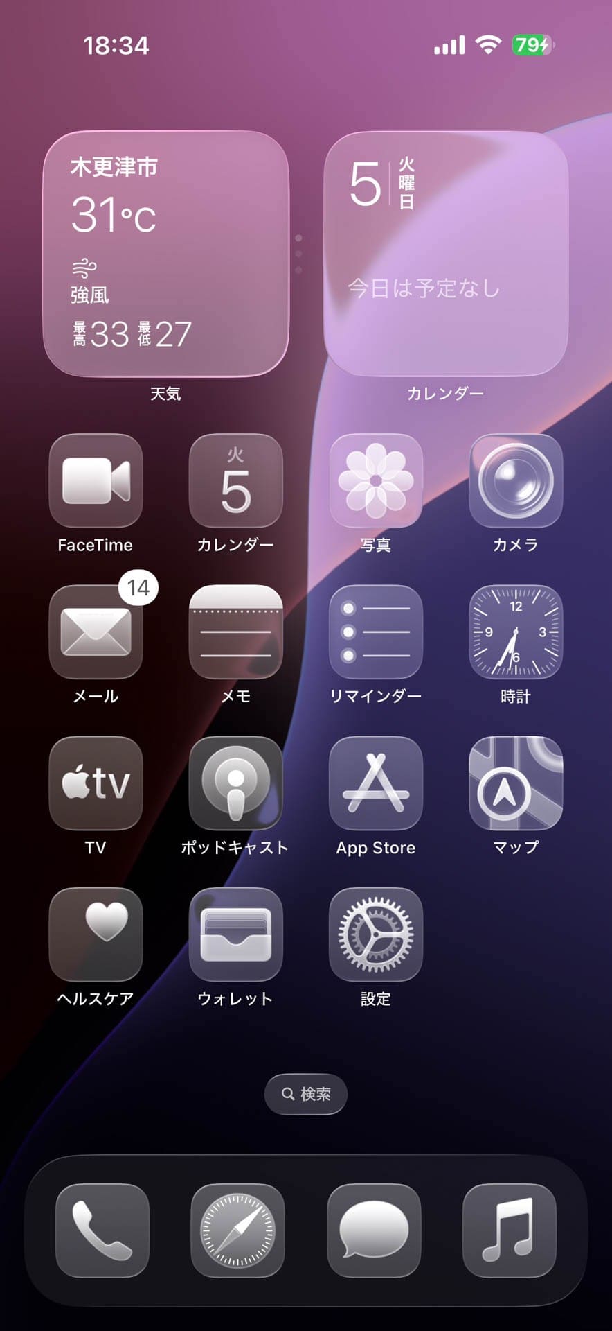 アプリアイコンの色調変更はiOS 18でも搭載されているが、iOS 26では選べる色調の中に「クリア」が追加されている。「クリア」ではアイコンの背景部分が透けるような感じで、Liquid Glassっぽさが強調される。