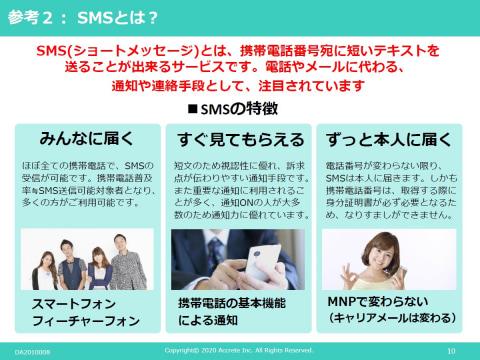 一方で先ほどのユーザー企業さんの意識だけでなく、携帯キャリアさんのほうも番号ポータビリティ制度によって、携帯メールのドメインを引き継げない事情も加わり、連絡手段として携帯電話番号に紐付いたテキストメッセージであるSMSは少しづつ浸透してきています。