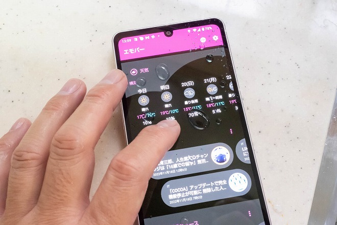 本体はIPX5/IPX8のお風呂防水に対応。一般的なスマートフォンだと、防水といってもディスプレイに水滴が付くと誤作動するケースがあるが、AQUOS sense7ではタッチチューニングで、 濡れた手でも操作しやすくなっており 、操作前にタオルなで水気を拭わなくて操作できるのはありがたい。