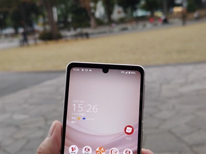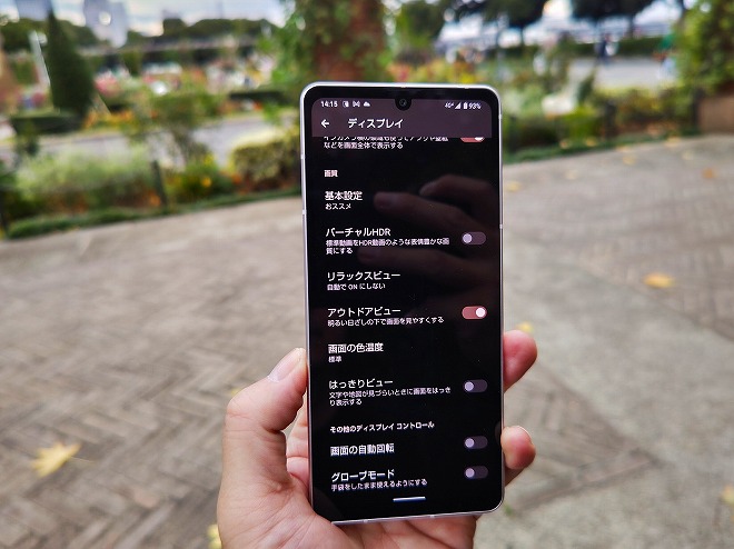 ピーク輝度は1300nitでコントラスト1300万:1とかなり明るくメリハリのあるディスプレイとなっている。そのため、 直射日光の当たる明るい屋外でも見やすい のが特徴。もちろん明るくするとバッテリーの消費も多くなってしまうが、明るい屋外で見やすくなる「アウトドアビュー」や、文字や地図画面などを見やすくする「はっきりビュー」といった機能が設定として用意されており、必要なときだけカスタマイズできるようになっている。
