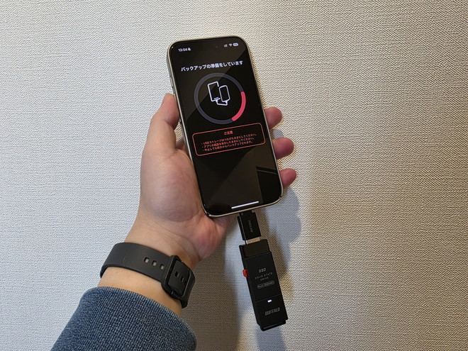 バックアップの作成中、特に初回はデータ量が多いため、ある程度の時間がかかるが、バックアップがあとどれくらいで終わるかは、アプリ内で確認できる。さらに、作業中には別のアプリを開いて操作もできるためストレスがない。ワイヤレス充電器がある場合は、充電しながらバックアップを作成することもできる。外付けストレージがある分、持ちにくさを感じる可能性はあるが、外れても問題がないため、気にしすぎる必要もないだろう。