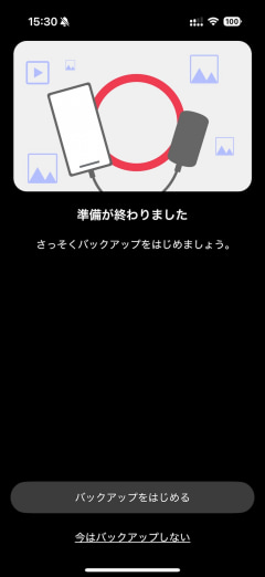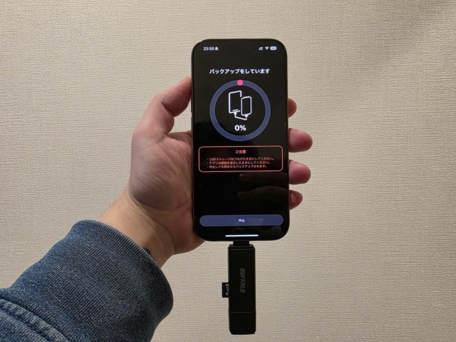 初期設定が終わったら、「バックアップをはじめる」をタップすると、バックアップの作成が始まる。バックアップの作成中に、外付けストレージを取り外しても、再度接続すれば、続きからバックアップ作成を始めることができる。